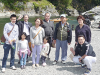 少し早めの昼食を「そば処むらた」でとり、お土産などを見たあと川原へ向い、石畳でちょっと休憩&記念撮影。そして、最初の目的地「伐採現場」へ向いました。
