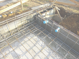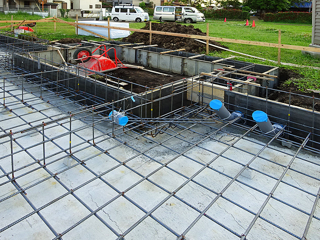 今回は基礎断熱工法を採用していますので、基礎工事と同時に断熱工事も行っています。さらに、給排水管の逃げ工事も同時に行っています。