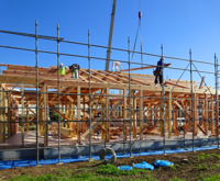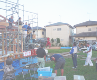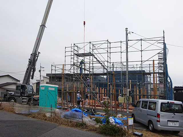 3日前に土台敷きを終えて、前日には先行足場が終了し、上棟準備ができました。(上棟の)当日は風もなく晴天に恵まれ、穏やかな非常に気持ちの良い日となりました。いつものメンバーによるクレーン作業も息がぴったりでスムーズに進行し、屋根の透湿防水シート貼りまで仕上がりました。突然の雨に備えてブルーシートで建物全部をすっぽり覆って作業を終了しました。