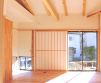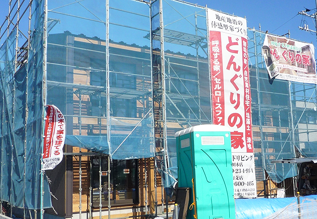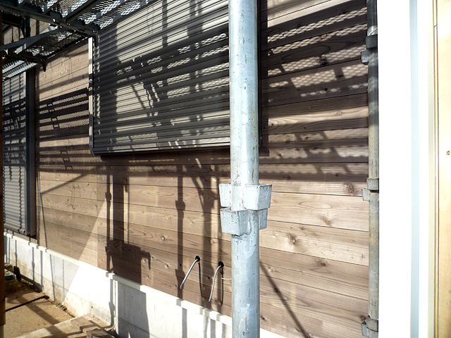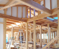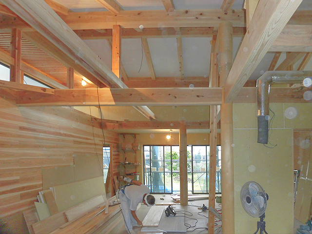 内部は燻煙乾燥材「ちばの木」の床材を貼り終わり、外周部の壁にはセルロースファイバーも吹き込みが終了しています。ご主人の部屋と奥様の部屋は、ほぼ大工工事終了です!お母様の部屋には、これからお仏壇が移築される予定です。ダイニングには神棚も移築されます。欄間も、リビングに移築します。構造が、ほとんど現しになっていることと、造作工事が多いので、大工さんがたいへんです(腕の見せ所です!)。(来月末まで)あと1ヶ月間、大工工事がかかる予定です。外部は、お施主様と一緒に塗装会で仕上げた「南京下見板貼り」縦押縁(腰板部分)が貼り終わり、雰囲気を醸し出しています。間もなく真っ白い漆喰系の欧州壁が塗り始まります。足場が取れた外観のお披露目が楽しみです!