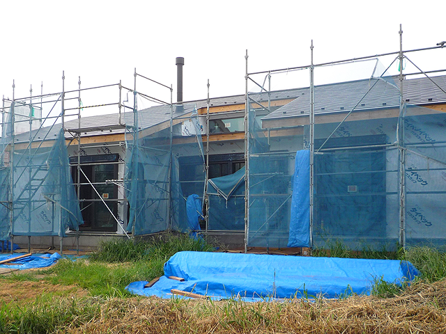 「モイス下地+遮熱シート」の外に通気層を設けて、その上にスギ板貼りの仕上げを行いました。早く足場が外れて全貌が現れるのが楽しみです!