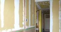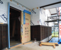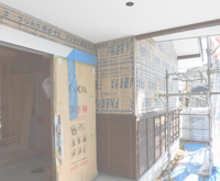 外壁工事は、「通気ラス工法」の上に下塗り作業が終了し、間もなく漆喰(しっくい)系塗り壁仕上げを行うところです。できあがると真っ白い壁になります! 内部は、大工工事が急ピッチで進んでいます。ご主人の部屋・奥様の部屋・ロフトは工事が終了し、お母様の部屋がもうすぐ終了です! 残りのダイニング・リビングの造作工事が終了すると、大工さんは次の現場へと移ります。(足場が外れた頃に、ウッドデッキ工事を行いに、また戻ってきますが…)最後に、現在お住まいの住居にある思い出深い彫刻欄間(らんま)と神棚、仏壇の移築が完了すると、大工工事が完了となります。