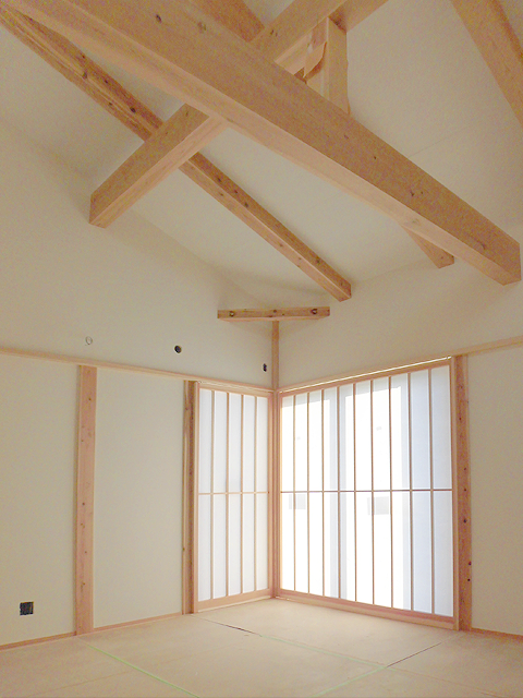 「想.sou シリーズ」の特徴でもある、構造が「現し」になりますので、2階の勾配天井と1階の天井は、ほぼ仕上がりに近い状態です。6寸角の大黒柱2本が目を引きます! 燻煙乾燥された柱・梁の色艶と香りが、とても心地よいのが「ちばの木」の特徴です。ぜひ一度、現場にお越しいただき、実際に触れて体感してください!