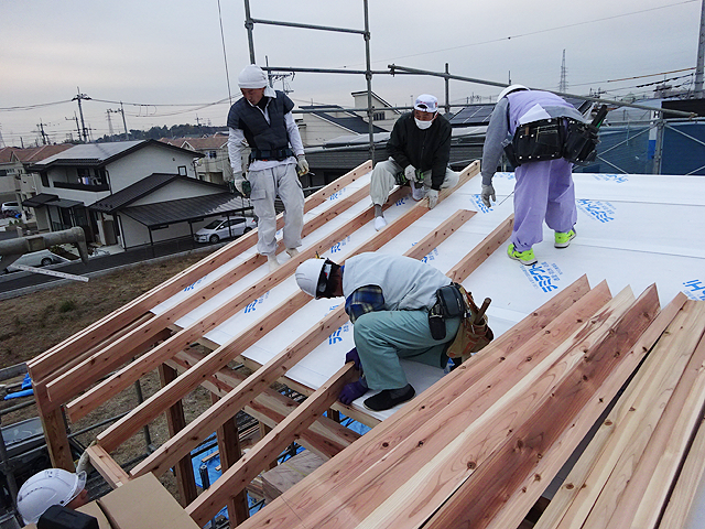 大工工事が完了しました! 上棟後から活躍していただいた林大工さんともお別れです。明日(12月28日)からは、左官屋さんが作業に入ります。