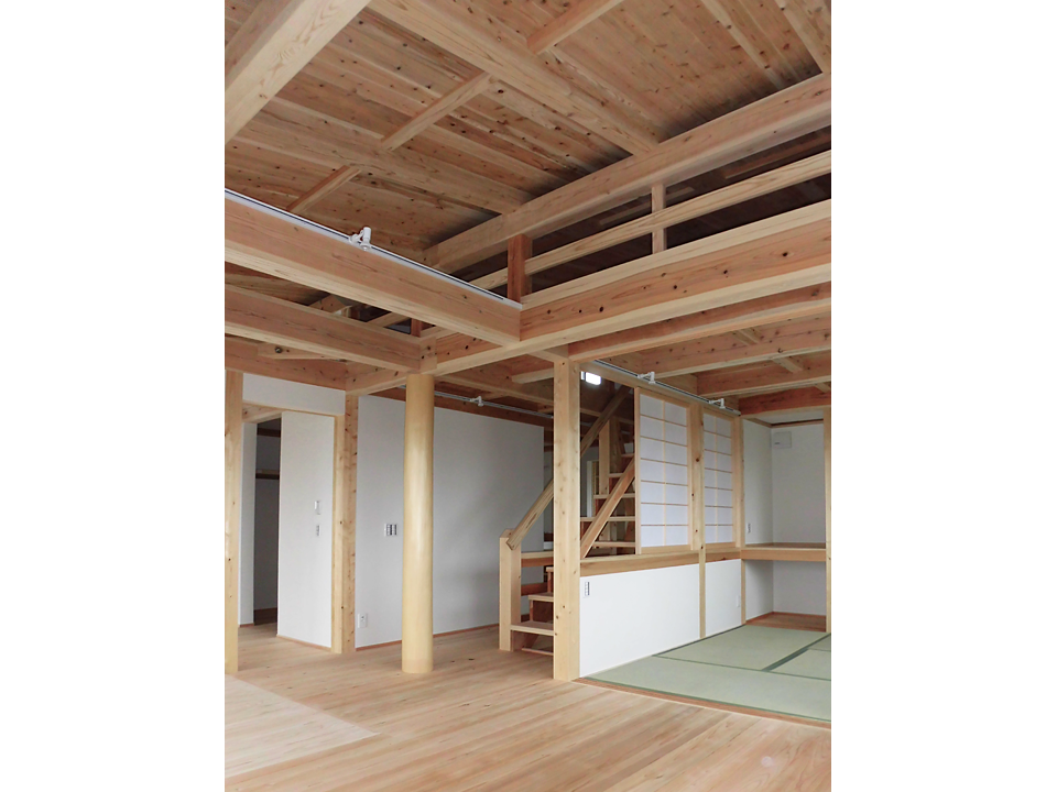 通常は横架材として使う梁を、縦に2本、出窓風に使用したところが唯一現しとなっています(2階の天井も)。「どんぐりの家」の特徴である勾配天井&屋根断熱仕様は変わりません。