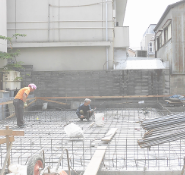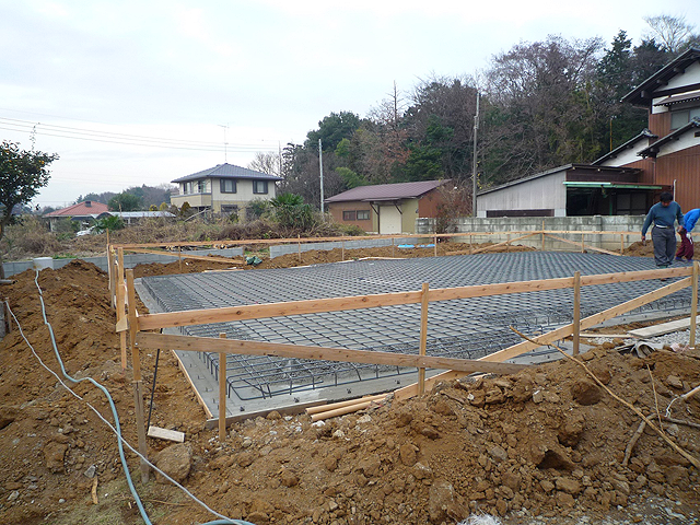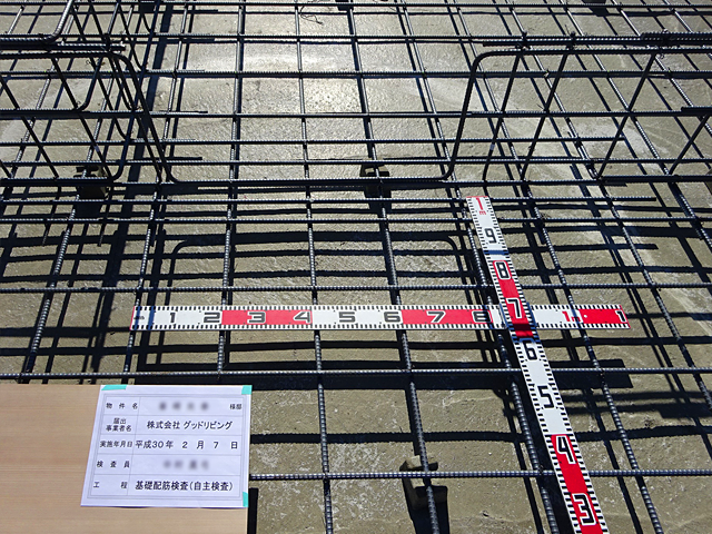 まずは表層に生い茂っていた雑草の根を綺麗に剥がし、設計GLに合わせて整地です。その後、左右の境界ブロック工事を先行しました!地鎮祭の際には、出雲大社より預かった鎮物を中央付近に沈めてベタ基礎底盤工事の始まりです。底盤打設後は、弊社検査員による鉄筋の配筋検査を行いました!