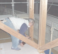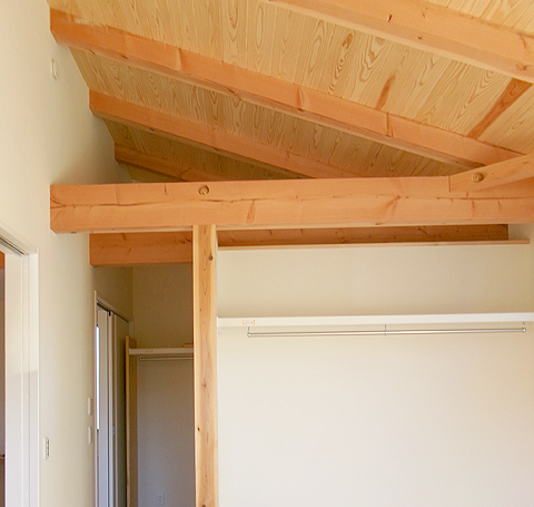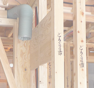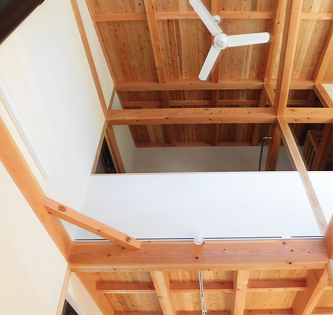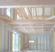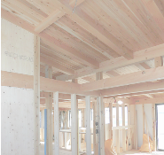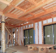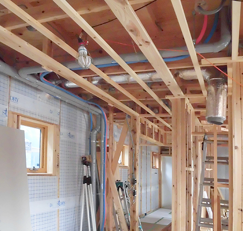 すでにこの段階で、屋根の断熱材セルロースファイバーの吹込み工事は済んでいます。また、屋根の天井材および登り垂木も仕上がりです。構造を重要視する「どんぐりの家」の特徴が、とてもよくわかります。在来工法でありながら、一部には金物工法を採用するなど、"ひと手間"を惜しまないのも特徴です。基礎断熱のため水道設備工事が早めに入ってきています。