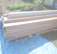 初夏のような好天に恵まれ、施工中現場のお庭を利用して外壁に貼る厚24mmスギ板に塗装を行いました! お施主様のご両親にもご参加いただき総勢9名での塗装会になりました! とてもチームワークが良く、口も手も動きが盛んです。午前中に本日の分を終了できました! 今回の塗料は、亜麻仁油ベースのプラネットカラー/ローズウッド色です。スポンジと布で刷り込むように伸ばしてムラなく塗っていきます。揮発性のため、塗料が染み込んだスポンジを日なたに置いていたら煙が出てきました! 使用上の注意書きにもあるように、火災にならぬように取扱い注意です!