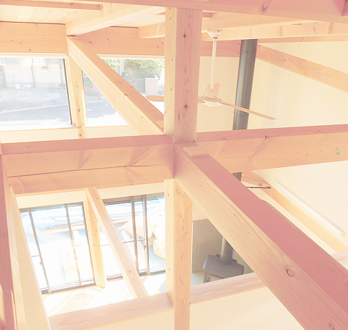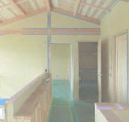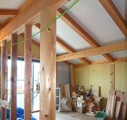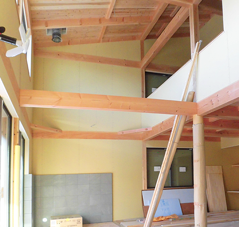 外周部分は構造用耐力面材「モイス」も貼り終わり、サッシも入りました。電気配線工事が終了し、薪ストーブ用煙突も先行で工事が終わりました。ロフトも形ができてきました。紀州産の床材厚30mmのスギ板も現場に入っています。まもなく外周部の壁に断熱材セルロースファイバーが吹込みになります。