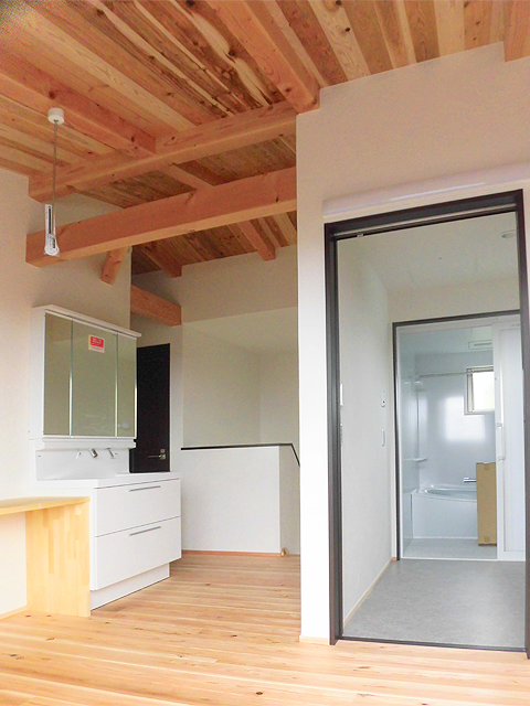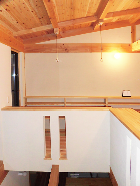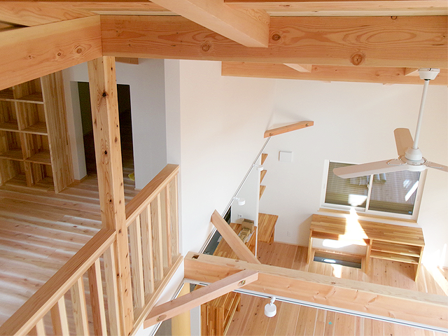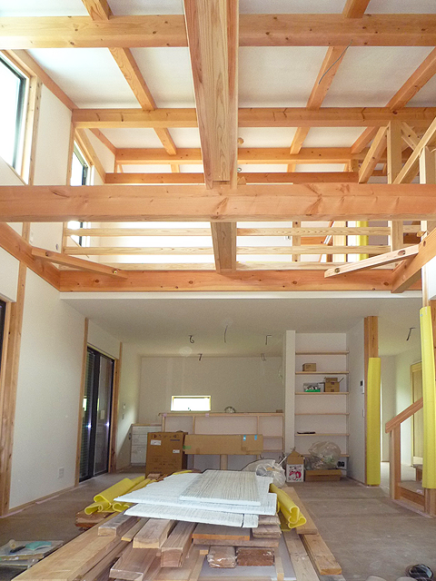 屋根断熱(セルロースファイバー充填)工事が終了し、棟換気も設置して屋根工事が終わりました。外壁には透湿防水遮熱シートが貼られ、縦胴縁も付きました。内部は大工工事が順調に進み、電気配線工事・ユニットバス工事が終了しました。間もなく断熱材セルロースファイバー(デコスドライ工法)の吹込み工事が始まります。2階の吹抜けの様子が良くわかるようになってきました!