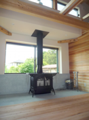 玄関アプローチが一体となった大きなウッドデッキができあがり、迫力が増してきました! インドネシア産のたいへん固い樹種の腐りにくいデッキ材を採用しています。デッキと室内の床が、ほぼフラットで、お父様の歩行に優しい設計です。バーモントキャスティング社製の薪ストーブ「デファイアント」が入り、存在感を出しています。その床壁には、蓄熱容量が豊富な十和田石が貼られています。室内のほとんどが勾配天井の現し構造という「どんぐりの家」の特徴が良くわかる建物が完成します。見学会を開催しますので、ぜひご覧になってください!