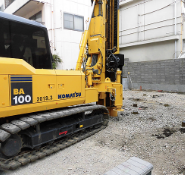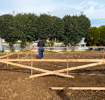 建物の解体後、急遽、一部ブロック塀のやり替え工事が発生しましたので、そちらを先に行い、その後に地盤改良工事を行いました。今回は「環境パイル(木杭)工法」です。(この工法は)作業が1日で終了し、養生期間なしですぐに基礎工事ができるので、工期が短縮でき、地球環境にも優しい"心強い味方"です。基礎工事は、会社設立以来ずっとお願いしてきた信頼できる丸山さんです!(丸山さんは)朝6:30に松戸の自宅を出て、高速使わずに1時間ちょっとで現地に到着するとのことです。