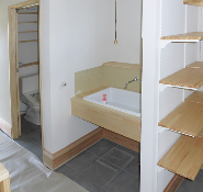 断熱材セルロースファイバー(デコスドライ工法)の施工が終了しました!外部では板貼り工事が始まりました。ヨロイ貼りするスギ板をお施主様に塗っていただきました!水回りでは浴室のユニットバスが最初に入りました。