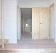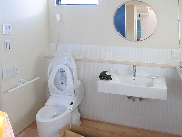 外部は足場が外れ、建物の全貌のお披露目です! 内部では、たくさんあった造作工事が終了し、大工さんが上がりました。いよいよ終盤戦。左官屋さんの登場です! ご両親の部屋の壁には珪藻土にワラ・スサを混ぜ、趣を変えるのに混ぜる量の打ち合わせも行いました。白い外壁が、建物を引き締まった表情に変えます。養生が剥がれると、いよいよ内部の全貌がお披露目になります!建物見学会ができるようになりましたので、お楽しみに!