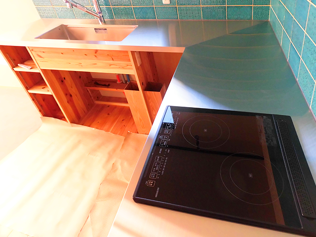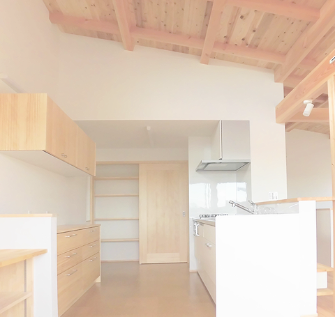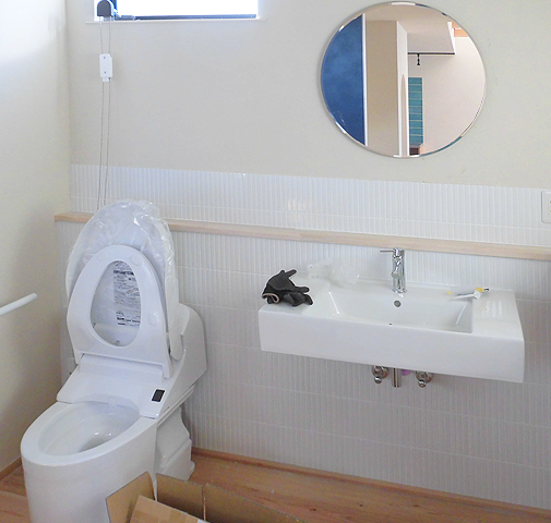 外部は足場が外れて、外観がお披露目になりました! 内部は珪藻土塗り壁仕上げが終わり、設備(トイレ・洗面・キッチンなど)の工事も終了しました。お施主様にも、寝室の壁一面を塗り壁仕上げをしていただきました! 間もなく内部の養生が剥がれて、内観のお披露目となります。土間のタイル工事と薪ストーブが入ると完成です。