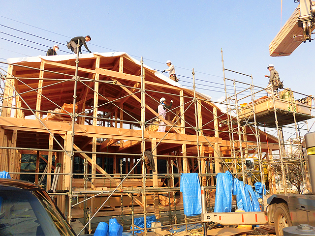土台敷きを早めに済ませ、綺麗に養生して上棟当日を迎えます!平屋建てとは言え40坪ありますので、日没までに終了するか微妙です。構造材に「現し」の化粧材が多くて、取り扱いがとても慎重になります!クレーンオペレーターとの息もピッタリで捗ります。棟梁に幣串を立ててもらい、四方にお神酒をまき、本日の1日が終了しました!