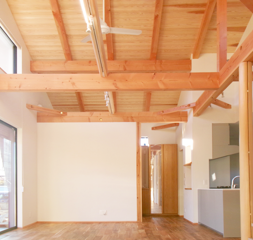 屋根は断熱材セルロースファイバーが充填され、ガルバリウム鋼板縦平葺き3.5寸勾配屋根が仕上がりました。外壁は調湿耐力面材モイスで覆われ、間もなく透湿防水シートが貼られる予定です。内部は大工工事に合わせて、電気・水道・ガスの工事も順調に進んでいます。現し構造となる勾配天井は、すでに仕上がりの状況です! 天井仕上げ材には、高性能調湿建材バウビオが貼られています。今回は、合板下地の剛床ではなく、根太仕様の基礎断熱工法を採用しています。