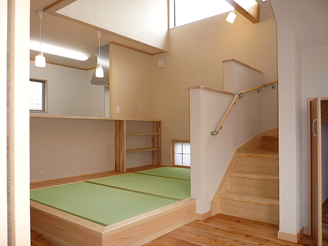 1階床はスギ板貼りです。「畳の上での食事」というリクエストにお応えして作らせていただいたダイニングの雰囲気です。