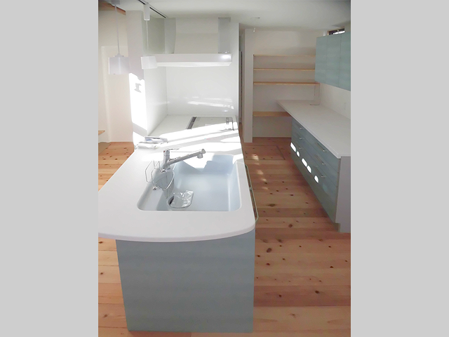 NEW 「新・想.souシリーズ」の南玄関タイプに設置したトクラス社製BB(リーズナブル)キッチンです。床は30mm厚スギ無垢板貼りです。