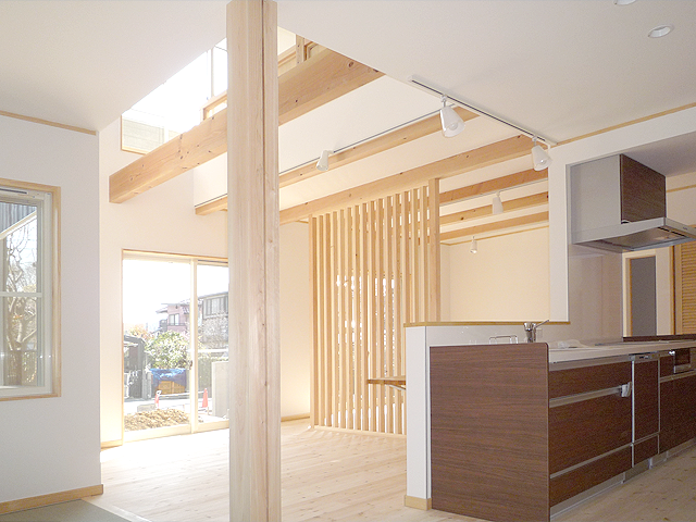 上部が吹抜けになったダイニングとオープンキッチンです! 縦格子の向こう側がリビングです。
