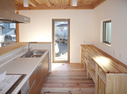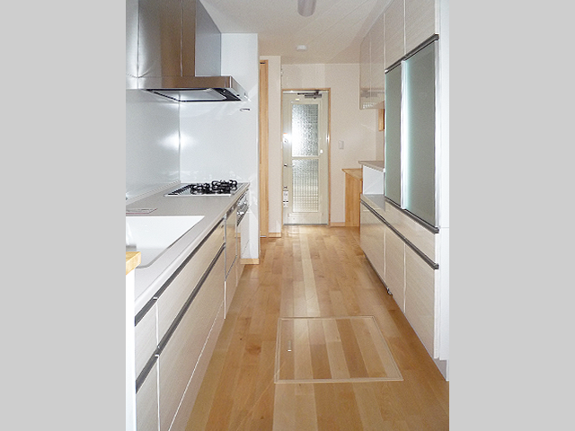 IHコンロ(オール電化)のキッチンです。床は水目桜(ウレタン塗装)を貼りました。