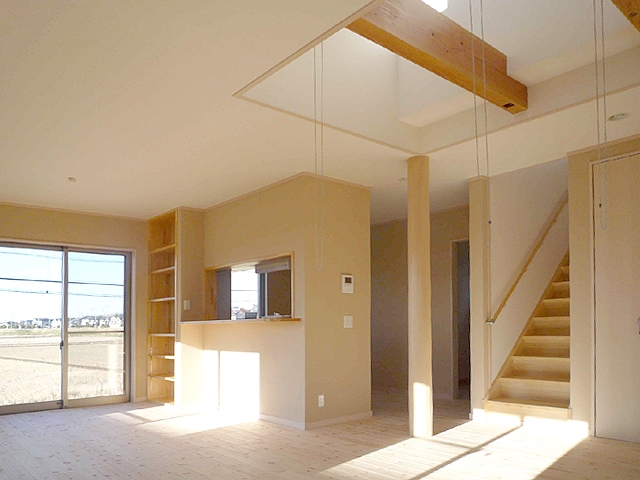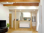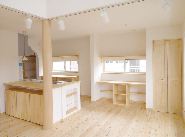 リビングから見たキッチンです。健康にたいへん良い「蓄熱暖房」が入りました。これで家中に温もりが繋がります。