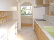 吊戸を付けずに、見晴らしの良いスッキリタイプのキッチンです。床にはタイルを貼りました。