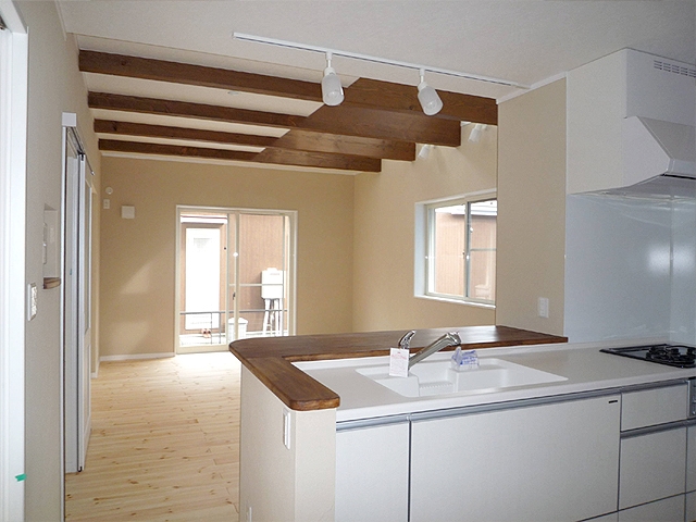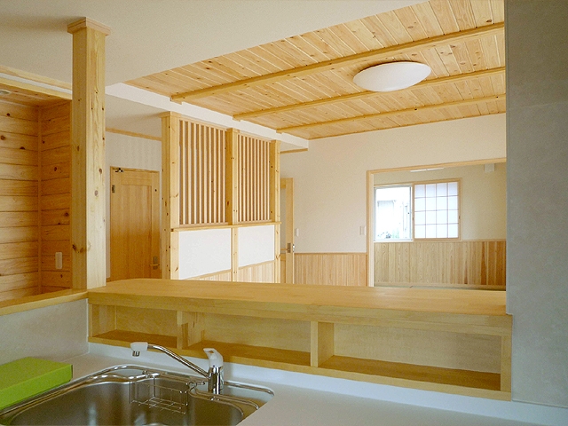 キッチン側から見たリビングです。流し立上り部分に大工さんのひと手間を掛けました。