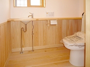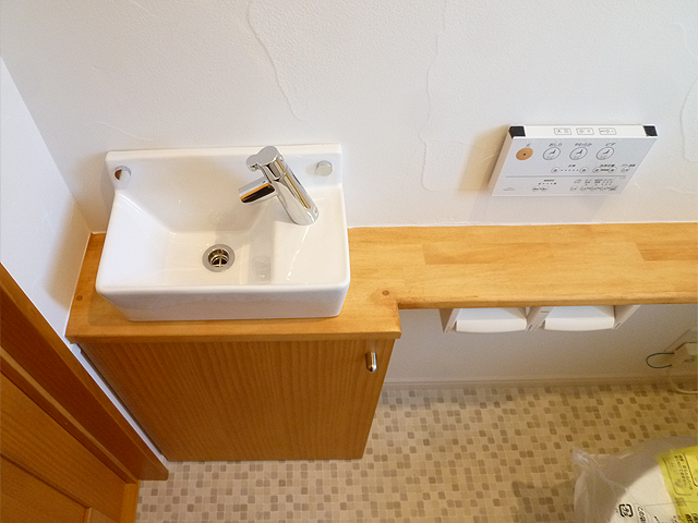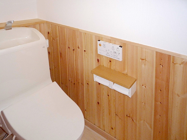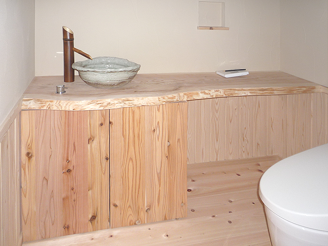手洗いカウンター付きトイレです。無垢板を一面に貼った「癒しの空間」になりました。