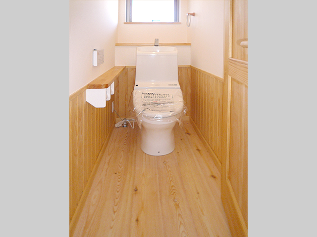 1階のトイレです。床板と腰壁板は全室統一されています!