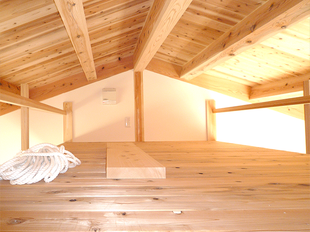 2階の子供部屋から上るロフトです。板貼り天井が子供部屋から繋がっていて「大空間づくり」ができました。
