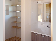 1階の洗面・脱衣室です。洗濯機の上に脱衣かご用の棚が付いています!