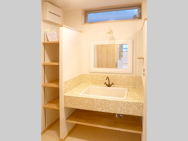 真っ白い「珪藻土塗り壁」と良く合うモザイクタイルで仕上げた洗面です。