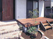 玄関アプローチと一体で造るウッドデッキです。アウトドアリビングが一層広くなります。