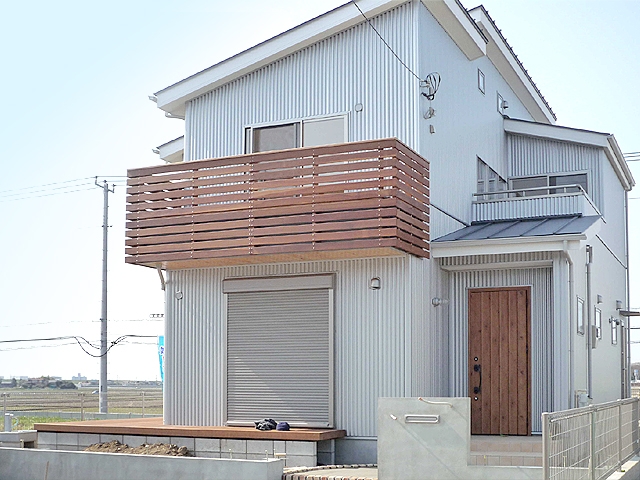 南側から見た外観です。ウッドデッキが付いて外構が完成すると、広い庭との一体感が出てきます。