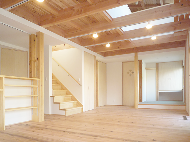 節少な目の床材(30mm厚スギ無垢板)で、明るく爽やかに仕上げたリビングです! 吹抜けは8畳近い広さです。