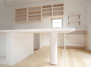 キッチン天板と一体で造作したカウンターテーブルです。調理場を1段下げて高さピッタリです!