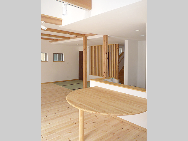 NEW 花井モデルハウス1階の和室にある、P-WOOD柱を繋げてできているオリジナルテーブルです。
