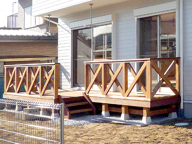 手摺りを付けないイージータイプ。素材はバルコニーと同じで、硬くて雨に強い「ウリン」です。塗装仕上げを施しました。
