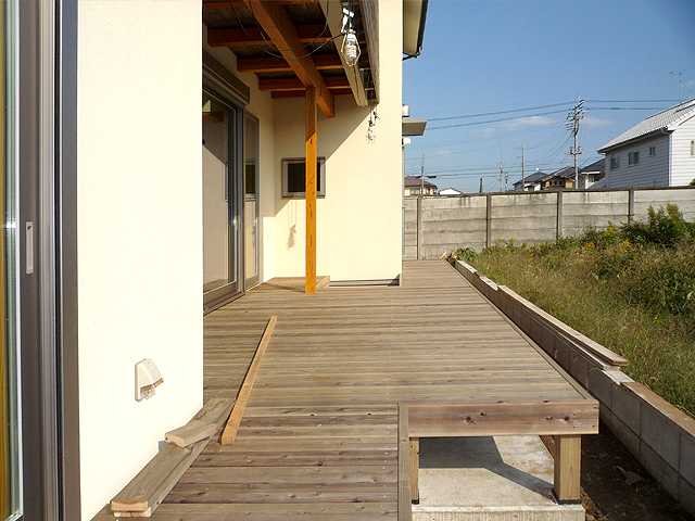 GLより高目設定のデッキです。ピンコロ基礎に束を立て、床下通風がとても良いウッドデッキが完成しました!