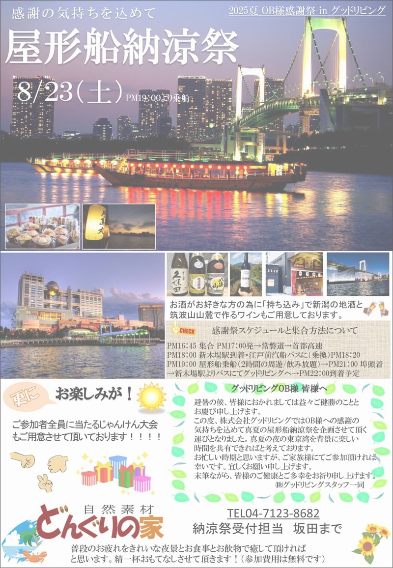 毎年8月の第1日曜日に、お客様感謝デーBBQ大会を開催しています。清水公園にて当社スタッフのほか、大工さんや職方さんも参加。総勢100人を超える大イベントです。
