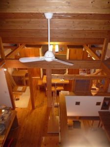ロフトから眺める1階リビングです。大きな吹き抜けの圧倒的な開放感を感じられる空間です。吹抜け上部のシーリングファンで、夏でも冬でも1階と2階の温度差をなくし、一年中快適に過ごせます。
