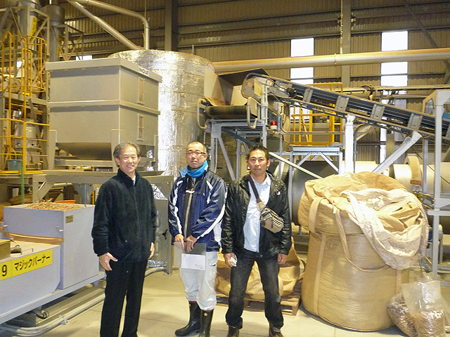森林組合では、佐藤組合長をはじめ、仲澤課長、鳥澤主任にお出迎えいただき、ペレットストーブで暖まりながらコーヒーもいただき、寛ぎながらの質疑応答のあと、施設内を見学させていただきました。