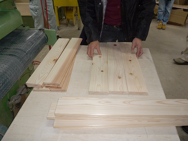除湿低温乾燥窯で約3週間乾燥させたスギ・ヒノキ・カラマツの床板・羽目板は、とても良い感じに仕上がっています。継続な仕入れのために、単価・生産体制などについて、さっそく交渉をスタートすることになりました!
