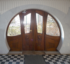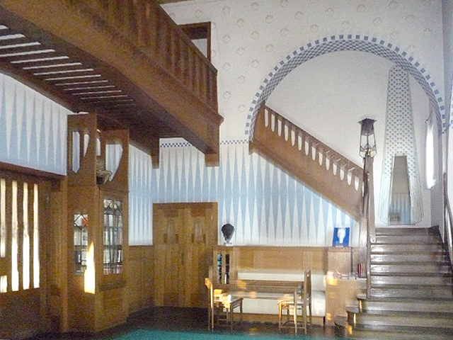 オルブリッヒ設計の家の内外です。1901年完成とは思えないモダンな造りです。曲線・直線・幾何学・装飾など、当時32歳の建築家の青春様式です!芸術・工芸にたいへん力を入れていたエルンストルードビッヒ(ヘッセン大公)が、地元の手工業を発展させようと、マチルダの丘に一万平方メートルの土地を用意して、各国から芸術家を集めて展覧会を開きました。第1回目が1901年に開かれ、1914年までに4回開かれました。初回に召集された中で、唯一、建築家のオルブリッヒが総指揮を取りました。